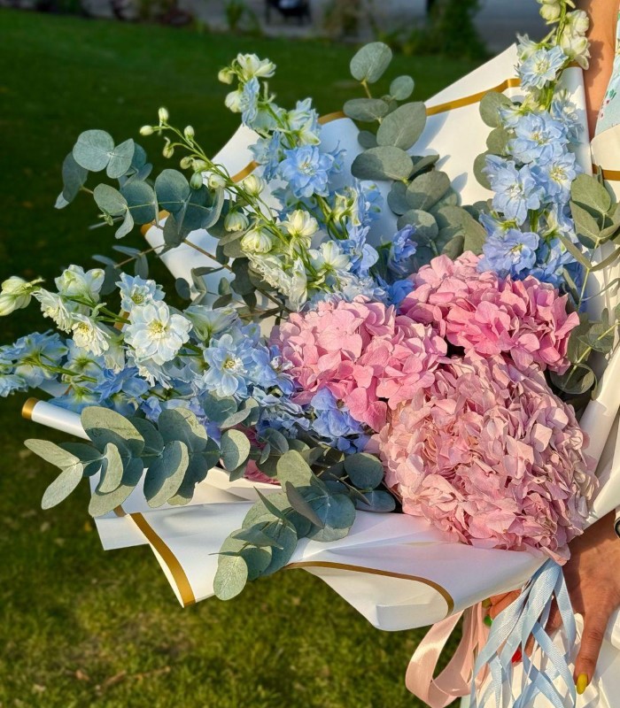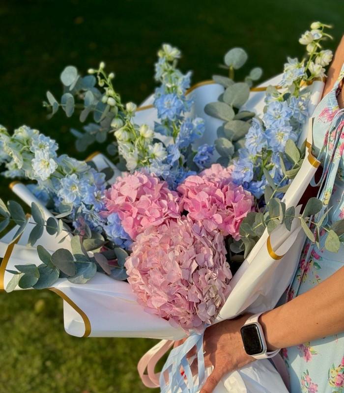 Blush Serenade is a graceful hand-tied bouquet featuring a soft harmony of pastel blooms, delicate textures, and fresh greenery — designed to express elegance, warmth, and heartfelt emotion. Carefully arranged by expert florists, this bouquet brings together premium seasonal flowers in gentle pink, blue, and ivory tones, creating a naturally luxurious look.